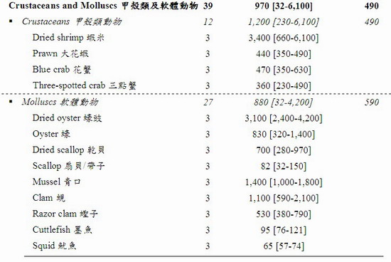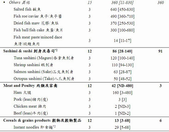 18. This study covered 11 food groups, namely (i) cereals & grains products, (ii) legumes and vegetables, (iii) meat and poultry, (iv) egg & egg products, (v) milk & milk products including frozen confections, (vi) fish, (vii) crustaceans and molluscs, (viii) non-alcoholic beverages, (ix) condiments & sauces (including non-iodised and iodised table salts), (x) sashimi & sushi, and (xi) seaweeds.