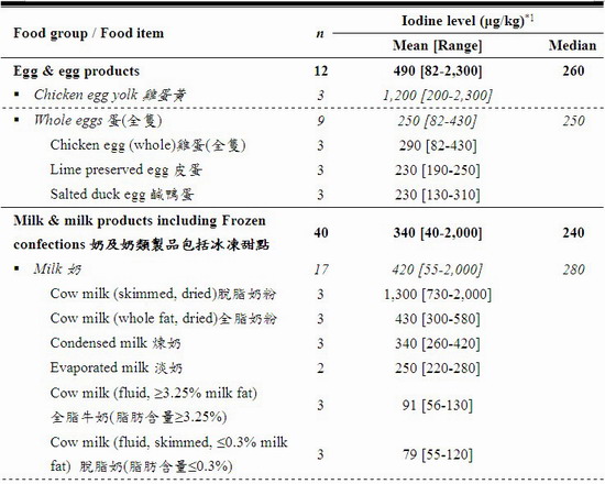 55. Iodine is present in many of the foods available locally and its content varied greatly within and among food groups. Seaweeds, iodised salt, seafoods, milk & milk products as well as egg & egg products were rich sources of iodine. The influence of cooking on the iodine levels in foods was minimal, except for boiling as iodine dissolved into the soup. About 93% population has iodine intake less than Chinese RNI. If iodised salt was taken as part of the diet, the dietary iodine intake in adults would be above the RNI but below the UL. Comprehensively assessing the iodine status of the local population using clinical and biochemical indicators as well as nutritional studies is urged.