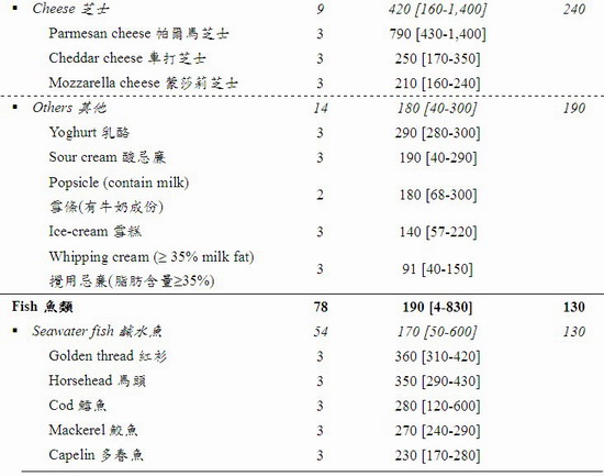 19. Between February and April 2009, food samples were collected from the local retail food markets and restaurants in Hong Kong Island, Kowloon, and the New Territories to include foods commonly consumed. Foods were selected with reference to the results of the Hong Kong Population-based Food Consumption Survey 2005-2007 for the population aged 20-84 years (FCS).[31] A total of 271 samples from 11 food groups (i.e. 92 food items, each with 3 samples unless otherwise stated) were collected. The list of food items covered in each group is shown in Annex I.