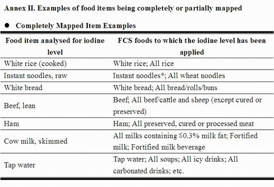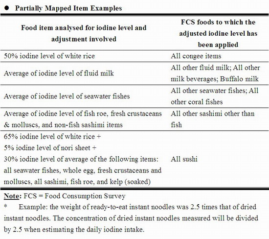 26. There were approximately 1,400 food items reported being consumed in the FCS but only 92 food items were analysed in this study; thus, a "mapping" procedure was adopted using two main principles: (i) for completely mapped items (i.e. those items being consumed or items similar to them have been analysed for iodine content), the mean iodine content of the three individual food samples analysed was used as their iodine content; and (ii) for partially mapped items, their iodine contents were estimated by comparing with relevant food items being analysed and calculating the respective contents by proportion. Examples of these items are outlined in Annex II. As the FCS data represented the amount of food as consumed, wherever relevant, yield factors were applied to adjust for the weight of the dried or raw foods from as purchased state (e.g. dried instant noodles) into as consumed state.[8]