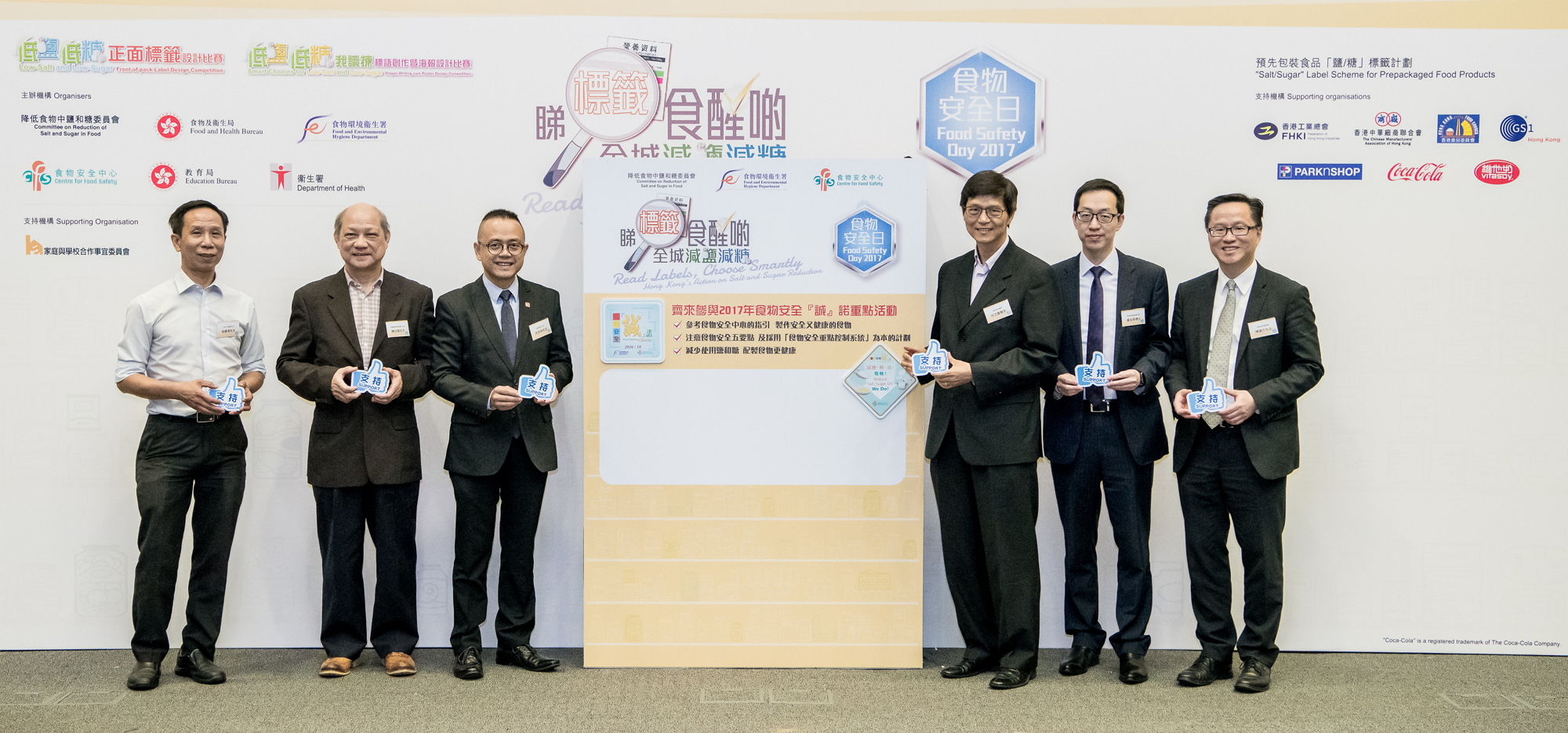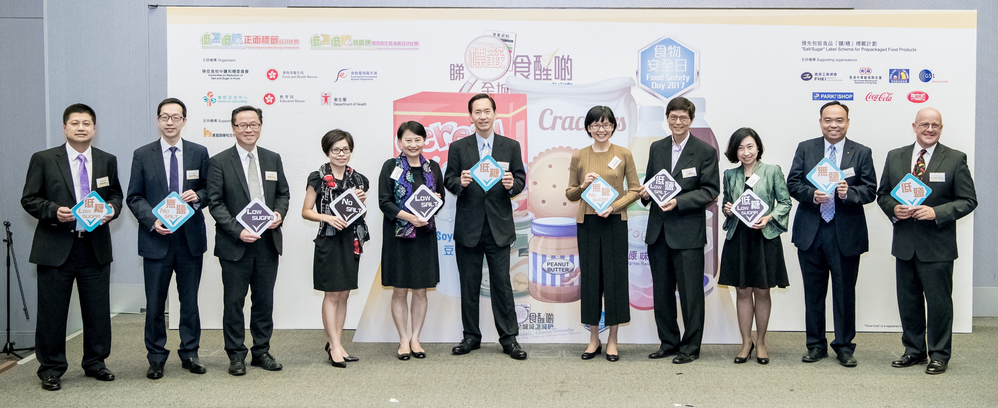 Photo 1:The Chairman of the Committee on Reduction of Salt and Sugar in Food, Mr Bernard Chan (sixth left); the Permanent Secretary for Food and Health (Food), Mrs Cherry Tse (fifth left); the Director of Food and Environmental Hygiene, Miss Vivian Lau (fifth right); and the Controller of the Centre for Food Safety, Dr Y Y Ho (fourth right), officiate at the Food Safety Day 2017 cum Launching Ceremony for the "Salt/Sugar" Label Scheme for Prepackaged Food Products. The Scheme is support by the Chinese Manufacturers' Association of Hong Kong, the Federation of Hong Kong Industries, GS1 Hong Kong, the Hong Kong Food Council, Coca-Cola China Limited, PARKnSHOP and Vitasoy International Holdings Ltd.