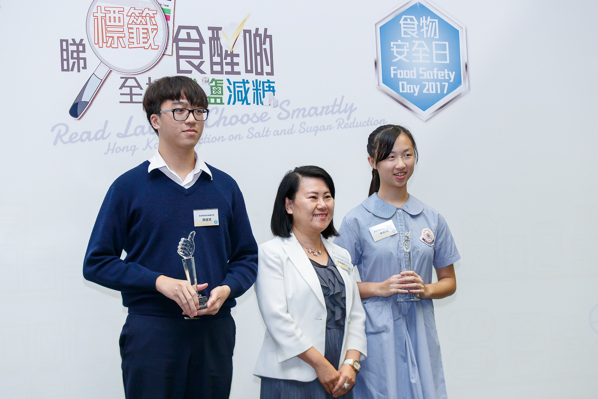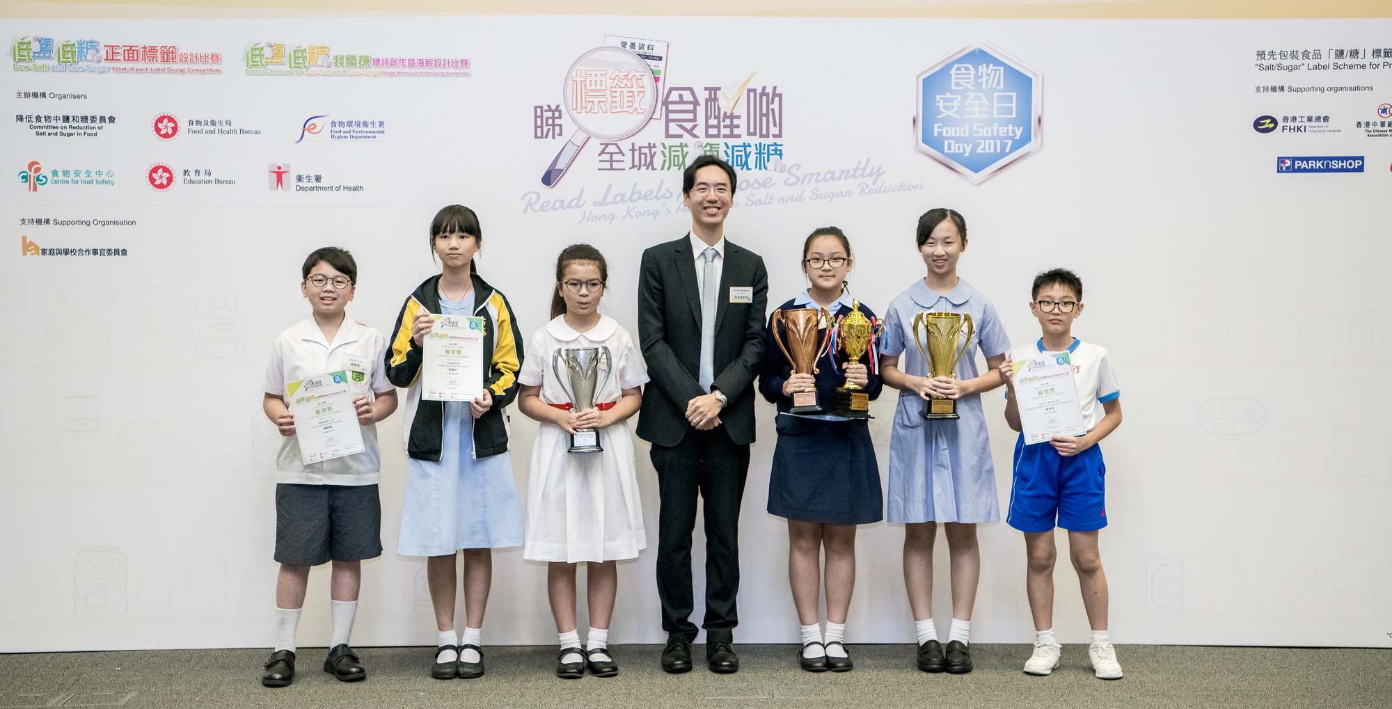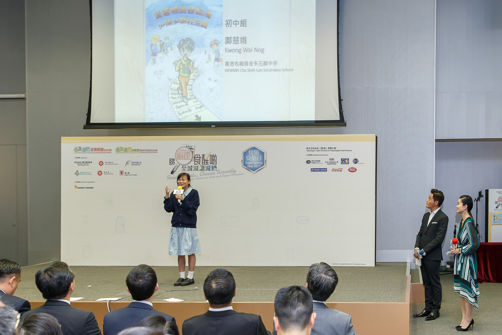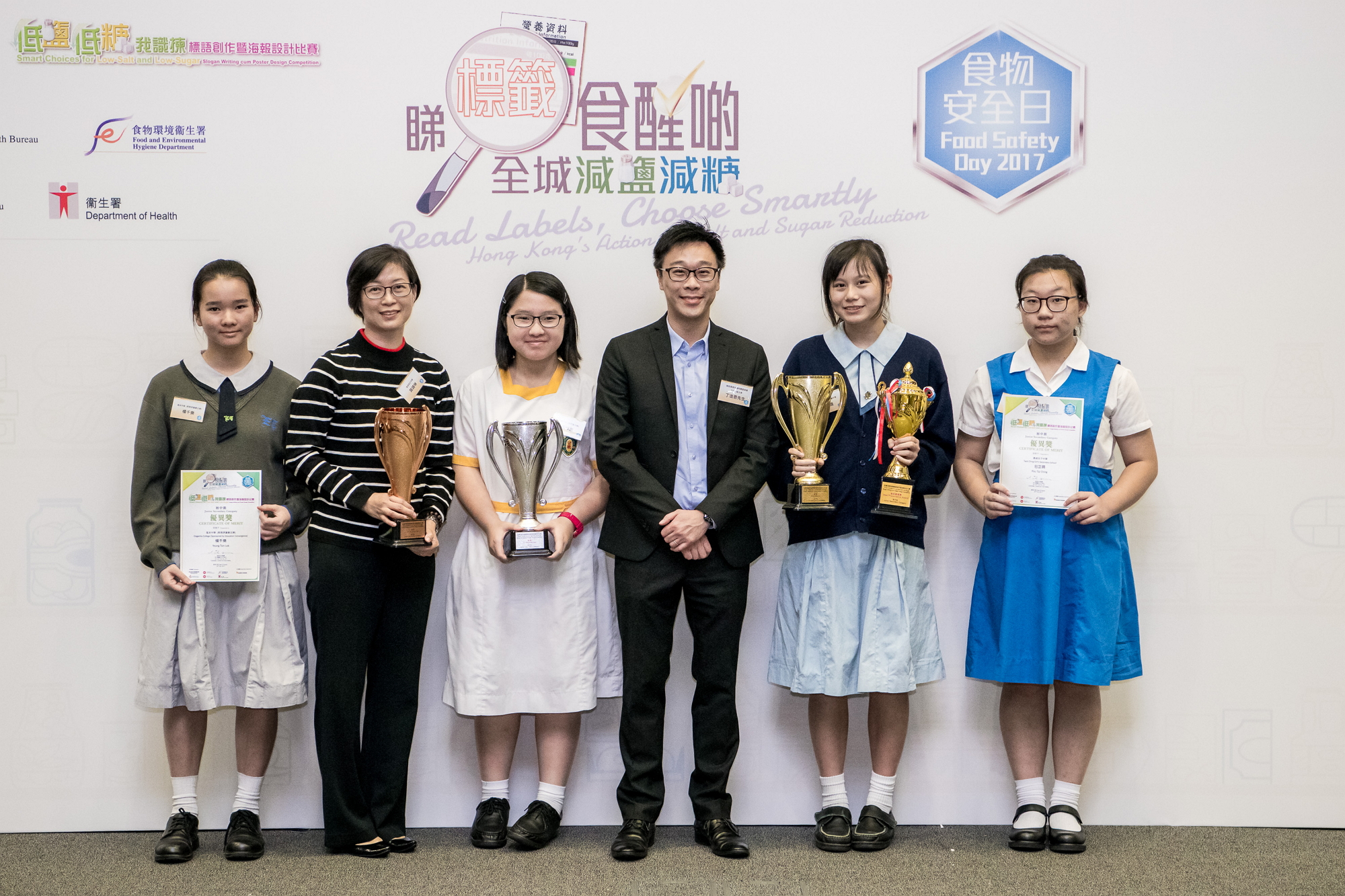 The Food Safety Day 2017 was held on 20 October (Friday) at Education Bureau Kowloon Tong Education Services Centre. The prize presentation ceremony of the Low-Salt and Low-Sugar Front-of-pack Label Design Competition as well as the Smart Choices for Low-Salt and Low-Sugar Slogan Writing cum Poster Design Competition was held on the same day. In order to promote healthy eating habits and remind students to reduce dietary intake of salt and sugar through the good use of nutrition labels, the Committee on Reduction of Salt and Sugar in Food, the Food and Health Bureau, the Education Bureau, the CFS and the Department of Health, in collaboration with the Committee on Home-School Co-operation, jointly organised the Smart Choices for Low-Salt and Low-Sugar Slogan Writing cum Poster Design Competition.