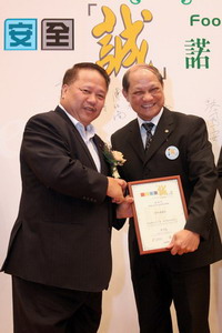 Hon Wong Yung-Kan, Vice-chairman of the Legislative Council Panel on Food Safety and Environmental Hygiene presented the Food Safety Charter Certificate to a food trade representative