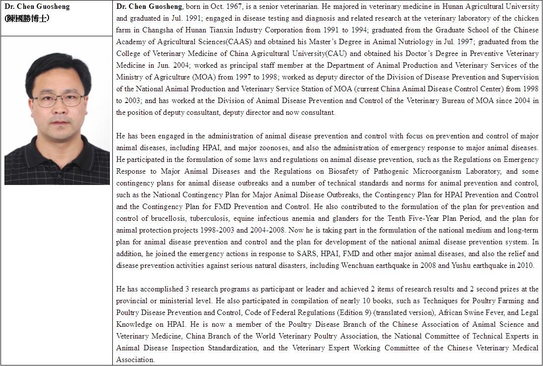 Consultant, Division of Animal Diseases Prevention and Control, Veterinary Bureau , Ministry of Agriculture, People's Republic of China |