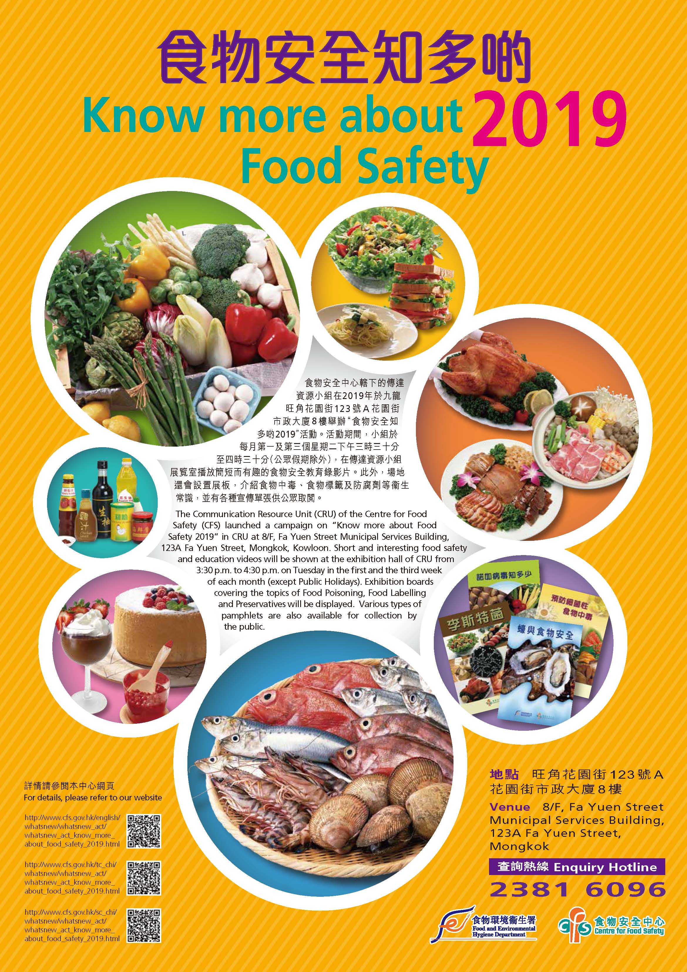 The Communication Resource Unit (CRU) of the Centre for Food Safety (CFS) launched a campaign on “Know more about Food Safety 2019” in CRU at Room 401, 4/F, Food and Environmental Hygiene Department Nam Cheong Offices and Vehicle Depot, 87 Yen Chow Street West, Kowloon. Short and interesting food safety and education videos will be shown at the exhibition hall of CRU from 3:30 p.m. to 4:30 p.m. on Tuesday in the first and the third week of each month (except Public Holidays). Exhibition boards covering the topics of Food Poisoning, Food Labelling and Preservatives will be displayed. Various types of pamphlets are also available for collection by the public.