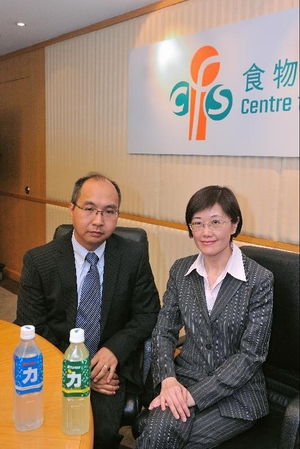 The Controller of the Centre for Food Safety (CFS), Dr Constance Chan (right), announced at a press briefing today (May 30) that the CFS would prohibit from noon tomorrow (May 31) imports and supply of two kinds of sports drinks produced in Taiwan by the Young Energy Source Co Ltd - Speed sports drink and Speed lemon flavour sports drink.