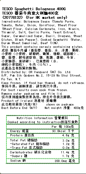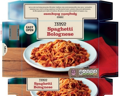 Product name: Spaghetti Bolognese Brand: Tesco Place of origin: Ireland Net weight: 400 grams per pack