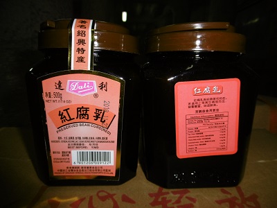 Product name: Preserved Bean Curd (Red) Brand: Dali Place of origin: China Packer: Zhejiang Cereals, Oils & Foodstuffs I/E Co., Ltd. Sole distributor in Hong Kong: Tak Fat Edible Salt & Provisions Limited Best before date: November 23, 2018 Net weight: 500 grams per bottle