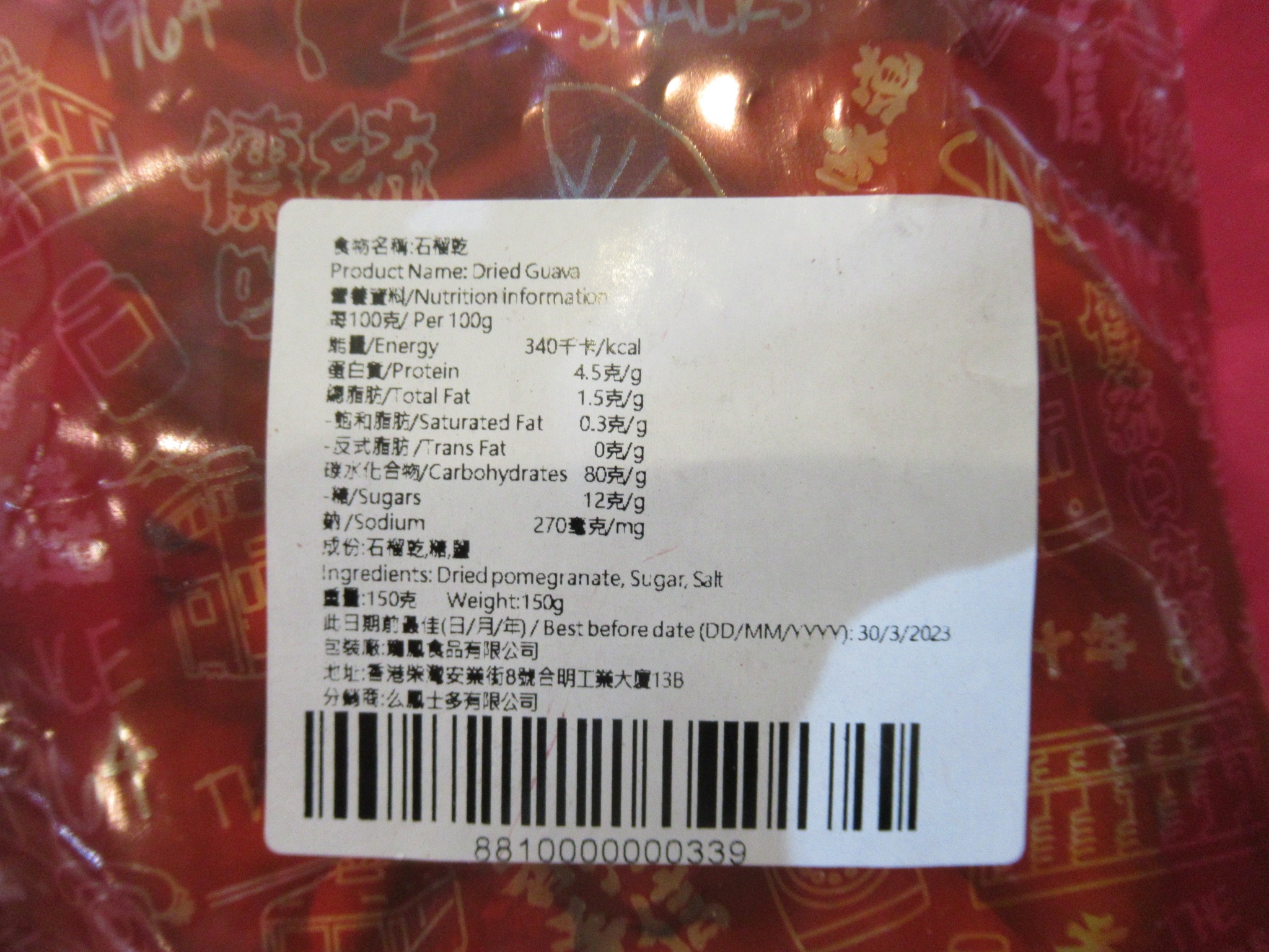 Product name: Dried Guava Brand: YIU FUNG STORE Net weight: 150 grams Distributor: (Not available in English) Best-before date: March 30, 2023 |