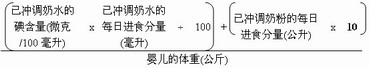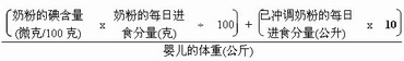 参阅容器上的营养标籤。如果碘含量是以"每100克奶粉"列出,而奶粉是以煮沸的自来水(约公升10微克)冲调,按照以下公式,你可以得知从奶粉和煮沸的自来水的碘摄入量(微克/公斤体重/日)将是: