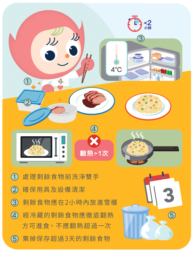 本文要点:处理剩余食物时可利用「食物安全五要点」中的「安全温度」,确保剩余食物贮存在安全温度范围内,减低食物中毒的机会。尽管如此,剩余食物亦应尽早进食,进食前须彻底翻热。