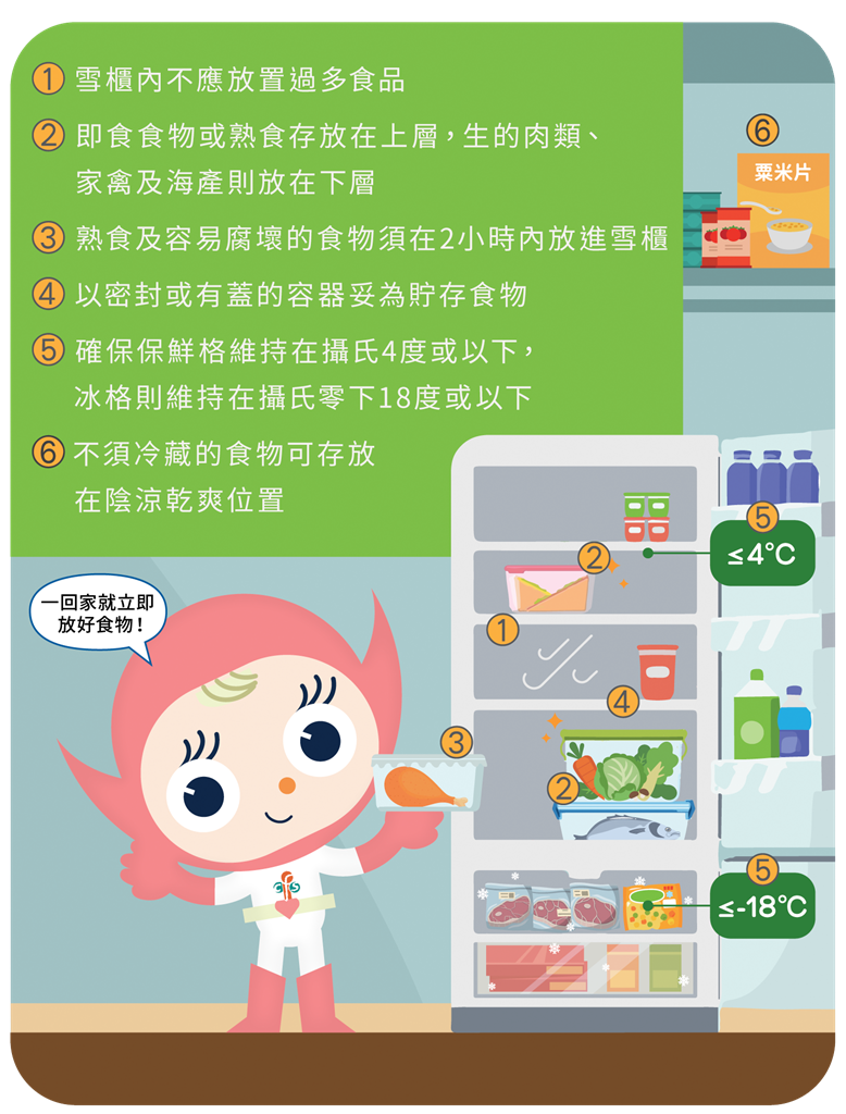 熟食及容易腐坏的食物(例如鲜肉、水产、瓶装牛奶及芝士等)须在 2 小时内放进雪柜。