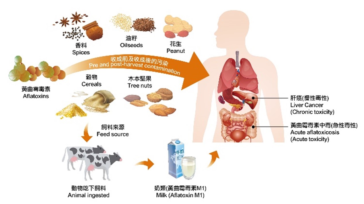 黄曲霉毒素是毒性最强的霉菌毒素之一,最常见于谷物、油籽、香料及木本坚果。摄入大量黄曲霉毒素可引致急性中毒(即黄曲霉毒素中毒),令肝脏受损并有可能致命。长期进食受黄曲霉毒素污染的食物可引致肝癌,其中受乙型肝炎病毒感染的人士如同时摄入黄曲霉毒素,其患上肝癌的风险比非乙型肝炎病毒感染者要高许多。