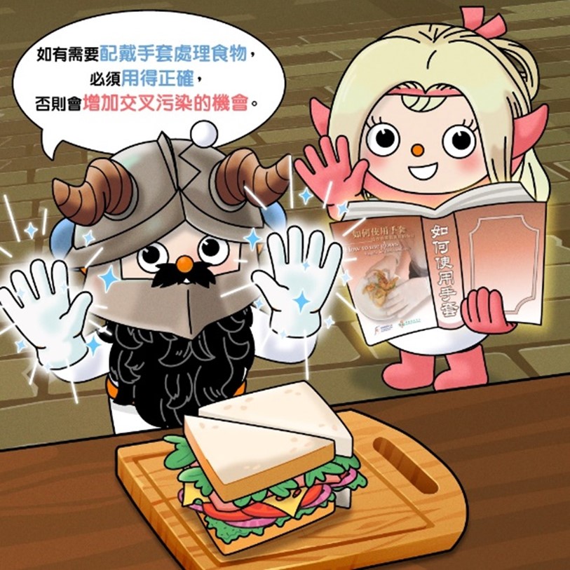 处理即食食物时如果需要戴手套,就要用得正确。否则的话,反而会增加食物交叉污染嘅风险!试想像戴住同一对手套去倒垃圾、清洁枱面、切生肉,再去整三文治,周围嘅细菌就会透过𠮶对手套传去即食食物,如果食咗,后果真系难以想像呀!
