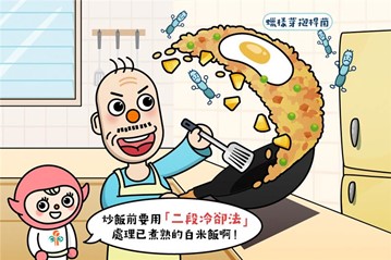 好多人会就咁将煮熟咗嘅饭放喺室温,之后再加入配料制作炒饭,咁做其实好高风险!喺室温“唞凉"期间,啲饭如果受到蜡样芽孢杆菌污染,加上长时间喺呢个危险温度范围注1,孢子就会发芽同产生毒素,足以令食炒饭嘅人食物中毒。原来蜡样芽孢杆菌产生嘅孢子同埋毒素可以抵抗高温,受到蜡样芽孢杆菌污染嘅“冷饭”就算炒熟咗,都歼灭唔到已经产生嘅孢子同毒素㗎!