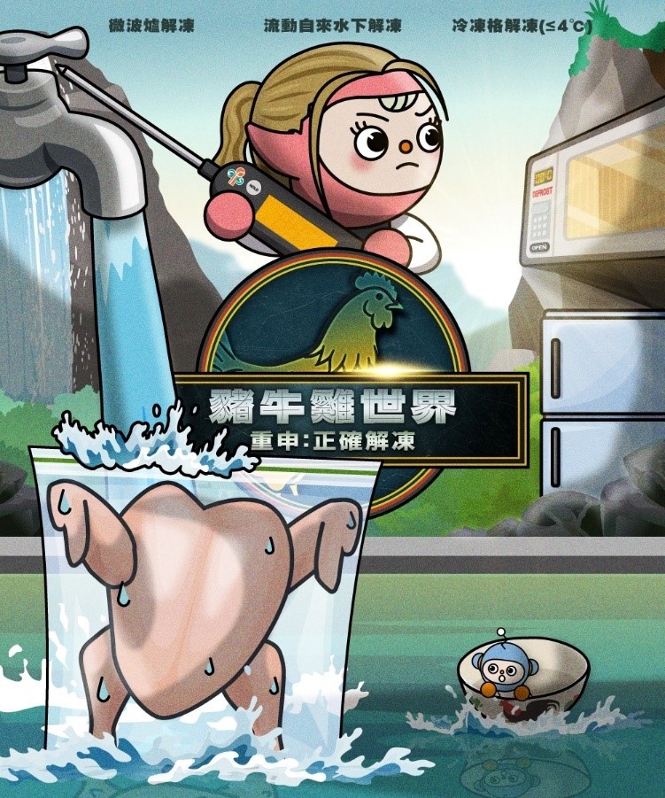 - 解冻生肉或家禽时,要用密封嘅容器包好,避免细菌随水花污染其他食物或者工作面。