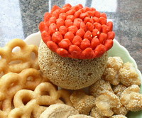 猪年已至。金色和红色寓意吉祥,是新春佳节人们喜爱的颜色,因此,金箔年糕和红色煎堆均为市民选购的热门食品。