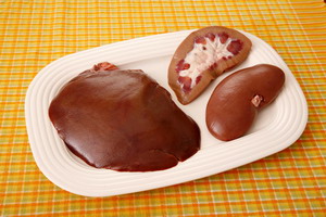 插图: 镉含量可能偏高的食物例子 : 猪肝脏 ( 左 ) 和肾脏 ( 右 )