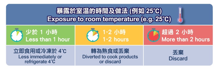 处理蠔只时,有多个工序如冲洗和去壳往往是在室温下进行的。这些处理工序在室温下进行的时间,不应超过一小时。蠔只在上菜前放置于室温下的时间累计不得超过二小时。