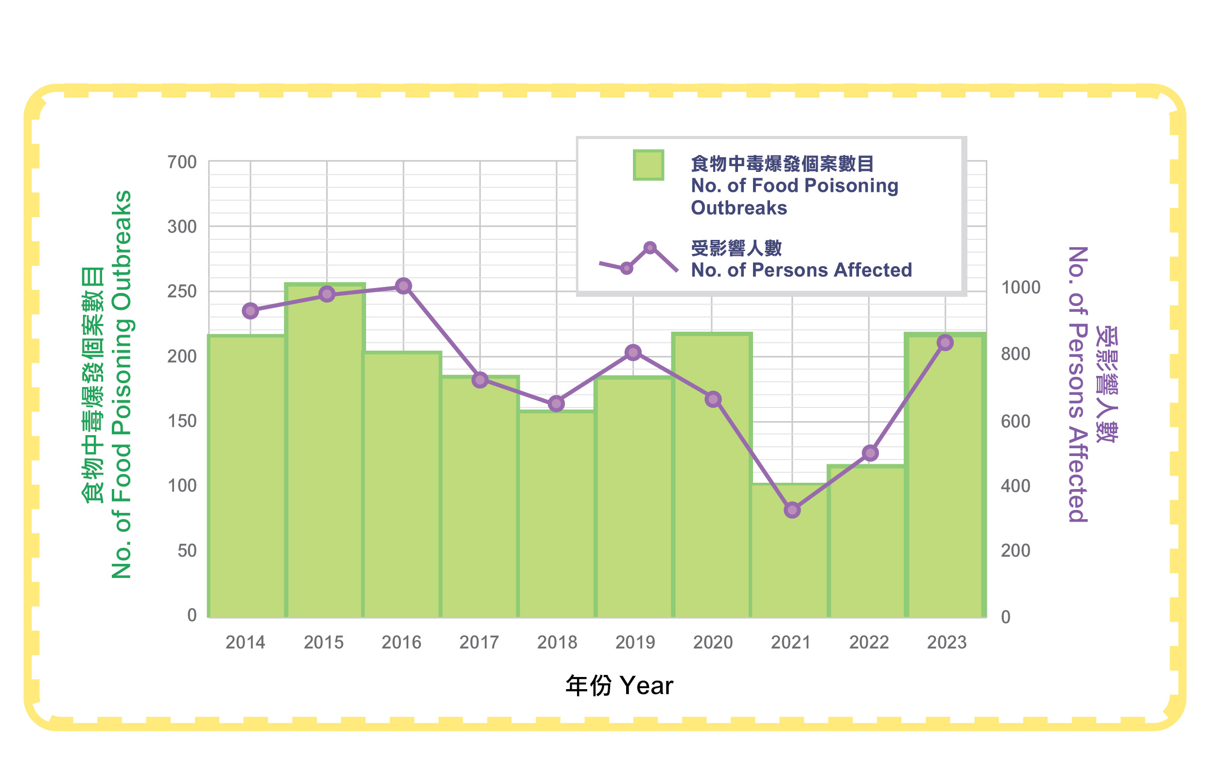 图:二零一四年至二零二三年有关食肆及食物业的食物中毒爆发个案数目及受影响人数