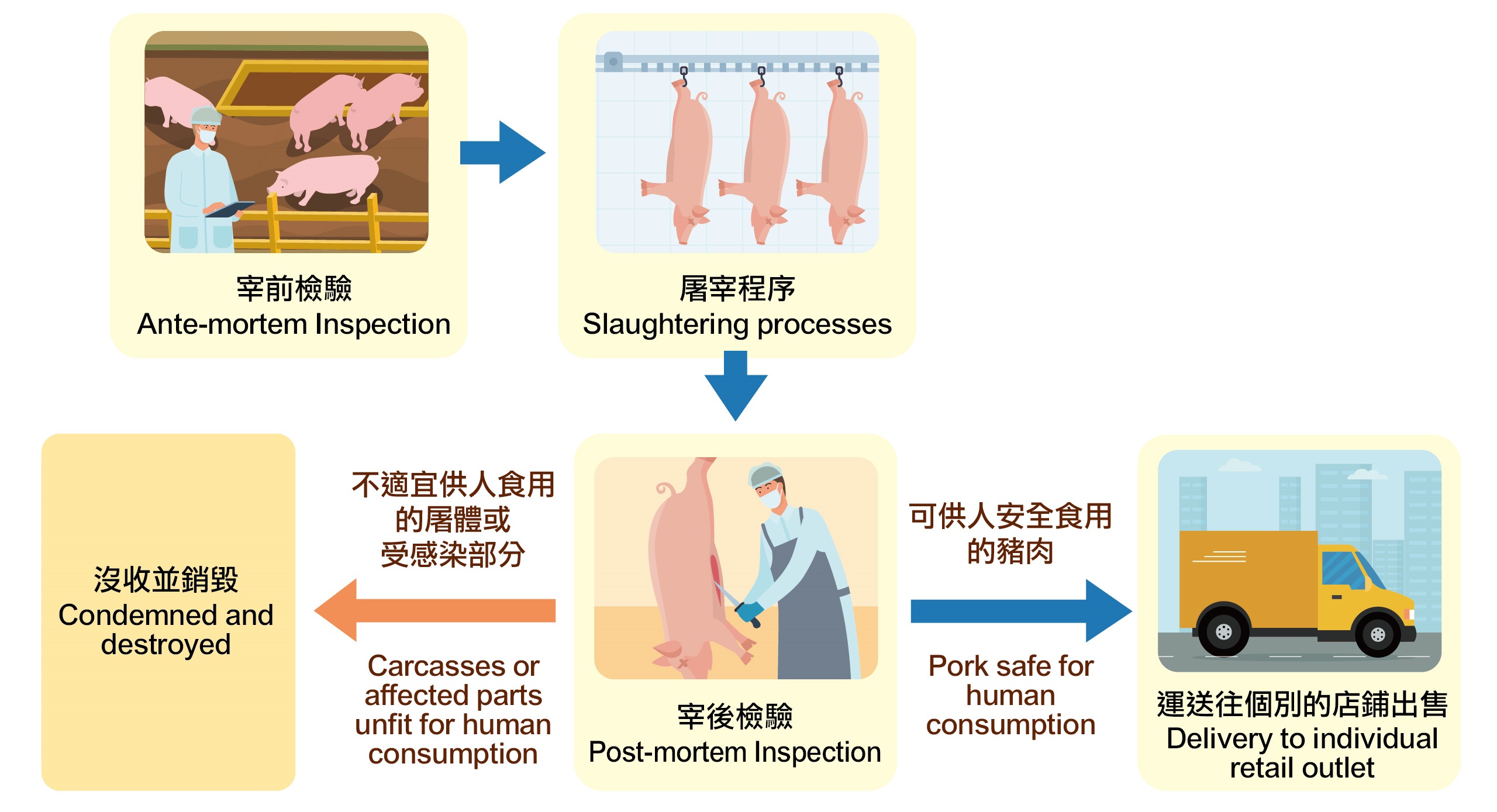 在宰前检验中,怀疑患病或受伤的猪只会被筛选作隔离屠宰。肉类检验由合资格的卫生督察负责进行。若卫生督察认为牲口感染疾病或其状况导致屠体、内脏或受感染部分不适宜供人食用,便会没收整个屠体、内脏或受感染部分,并安排将之销毁。