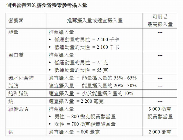 可耐受最高摄入量 — 指通常不会对某特定年龄及性别羣组的人的健康带来不良影响的风险的最高营养素摄入数值。此数值并非是建议的摄入水平。如有充分证据证明某营养素会对健康造成不良影响,该种营养素便会订有可耐受最高摄入量。常量营养素(碳水化合物、蛋白质和脂肪)并没有订定可耐受最高摄入量,主要原因之一是有许多风险因素(如缺乏运动和吸烟)均可引发慢性疾病,因此,无法厘定特定的摄入水平作为可耐受最高摄入量。