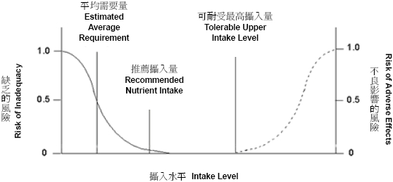 简言之,适宜摄入量和推荐摄入量都是为满足某特定年龄及性别羣组中几乎所有身体健康的人的需要而制定的,因此,两个数值可视作目标营养素摄入量。至于营养素对健康造成不良影响的风险,则可采用可耐受最高摄入量作为指标限制摄入水平。如营养素摄入量增至高于可耐受最高摄入量,对健康造成不良影响的风险便会增加。