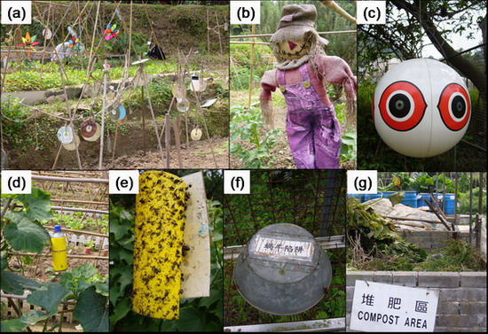 图1.本地有机农场:(a-c)驱鸟装置;(d-f)捕虫陷阱;(g)堆肥区