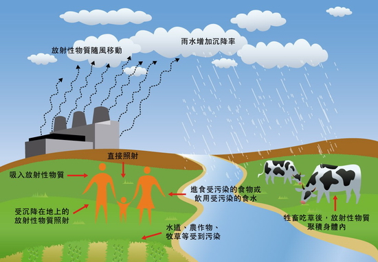 图一: 在核事故中,放射性物质可能会释放到外部。这些看不见的放射性物质会像烟雾般扩散到空气中,并在空气中或随雨水沉降,令水果和蔬菜等食物或动物饲料的表面受到污染。放射性物质其后会由土壤转移至农作物中,又或透过吸入或进食受污染动物饲料的途径进入动物体内。此外,鱼类和贝类亦会从水中摄入放射性物质。放射性会随时间在食物中不断累积。