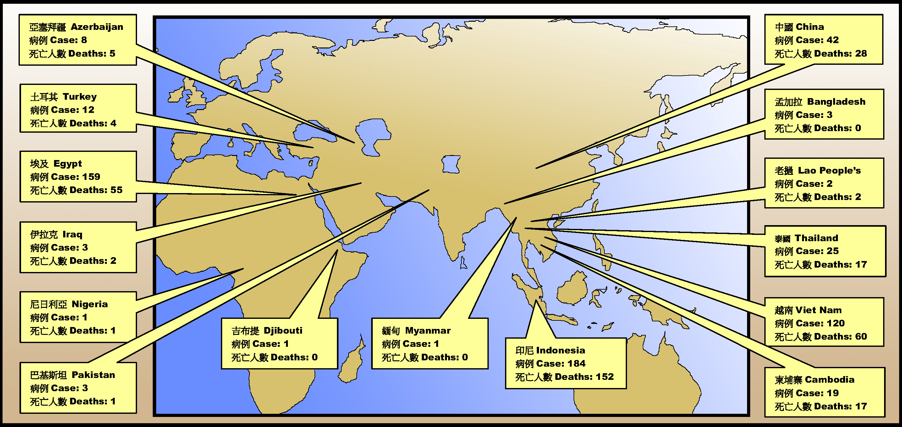 图一﹕自二零零三年起出现人类感染H5N1禽流感确诊病例的地区(截至二零一二年一月二十四日,资料来源:世界卫生组织)。