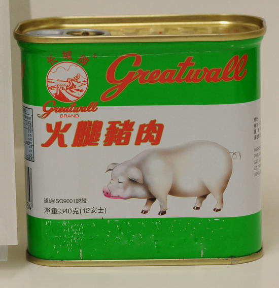 图示被验出含汞的罐装「长城牌火腿猪肉」。