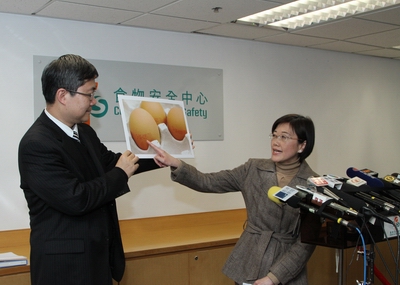 食物安全专员陈汉仪医生(右)今日(一月十日)会见新闻界时,向出席者指出德国输港鸡蛋上的镭射印字样。旁为食物安全中心首席医生(风险管理)吴志翔。