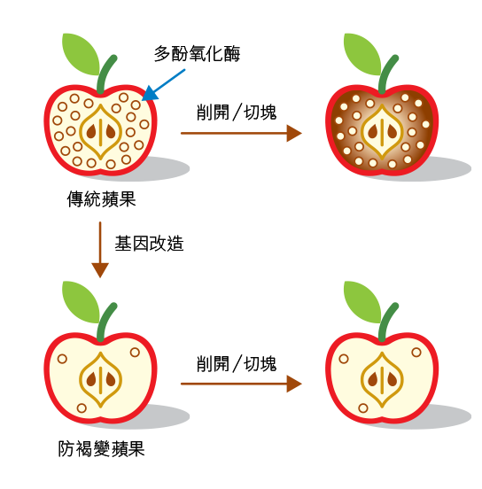 为减少苹果的废弃量,并方便消费者,吸引他们选购苹果,科研人员研发出一种不会褐变的基因改造苹果,透过抑制褐变反应中的一种名为多酚氧化酶的酵素发生作用,防止苹果转为褐色。这种基因改造苹果几乎不含多酚氧化酶,不会发生褐变反应,因此,苹果不会在咬开、切块或碰伤后变成褐色。