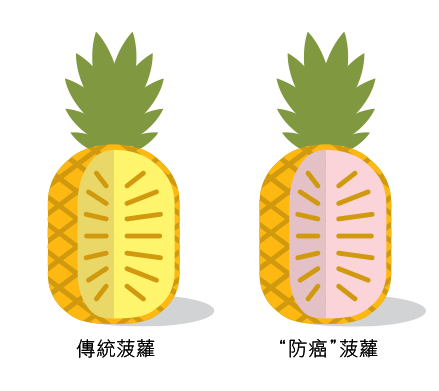 番茄红素是一种天然物质,正是这种物质使番茄呈现红色。番茄红素属抗氧化物,或有助降低罹患某几种癌症的风险。为提高番茄红素的膳食摄入量,科研人员对菠萝进行基因改造,从红桔提取一个基因,使该基因大量表达,另外抑制两个影响番茄红素合成的内源基因,让番茄红素蓄存于菠萝的可食用组织中,基因改造菠萝的果肉因而呈粉红色,容易与传统菠萝分辨开来。