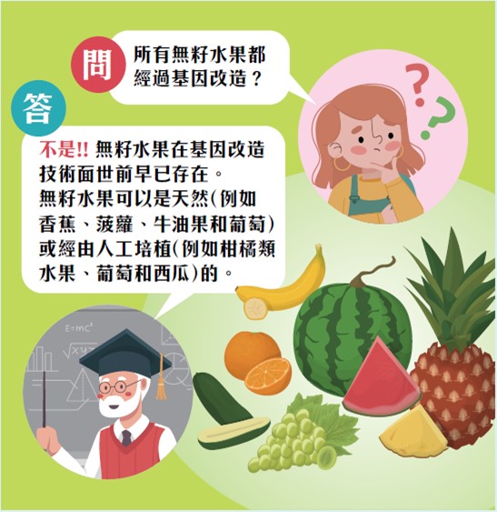 无籽水果,例如葡萄、橙和西瓜,在本港市面很常见。吃水果时把果籽吐出,既令人尴尬又有失乐趣。因此,大家都喜欢吃无籽水果或至少是果籽不太多的水果。除无籽水果外,超甜粟米和紫心蕃薯等农作物亦较受青睐,因为很多消费者认为它们在味道或外观上较市面的其他品种优胜。虽然有传闻指这些无籽品种产自基因改造生物,但目前的无籽农作物并非基因改造食物。