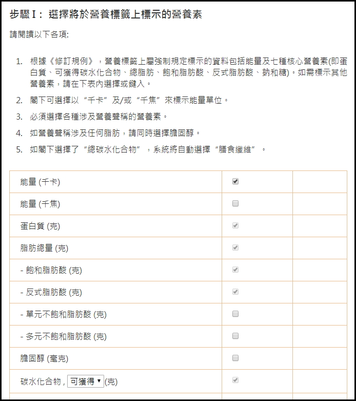 - 步骤I:选择将于营养标籤上标示的营养素。