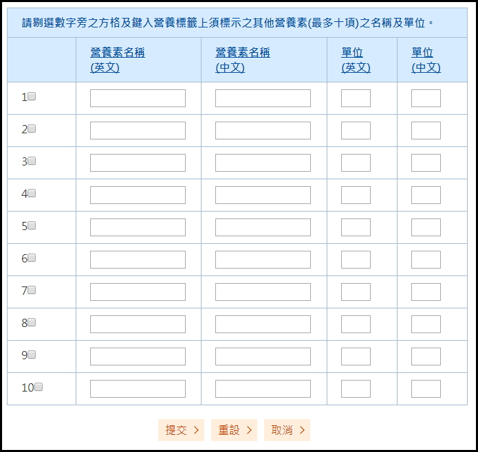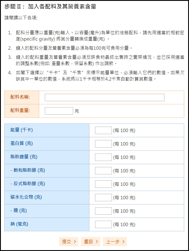 - 请注意,如没有输入营养素英文名称及∕或单位,计算器只会制备中文营养标籤。