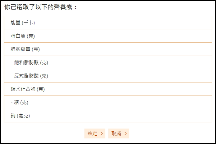 - 系统会要求使用者确定所选的营养素已在列表内,点击: