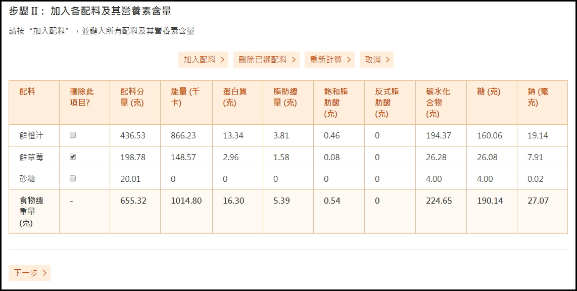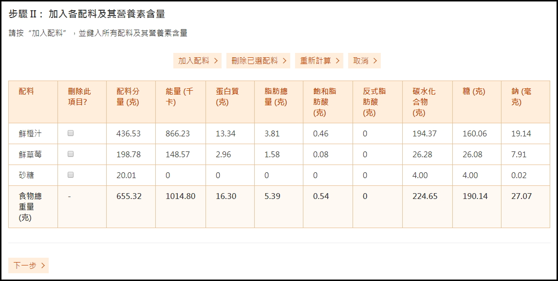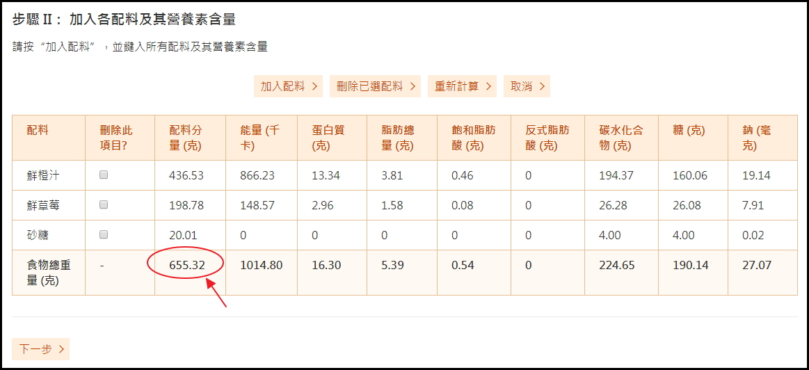 - 表上最后一行显示最终产品的配料总重量(克)及每种营养素的含量,即使用者在步骤1至5和步骤11中输入每种配料所含各类营养素的总和。每种配料的营养素含量是根据每种配料的重量(克)乘以每100克(可食用部分)的营养素而得出。在点击"下一步"以进行列印标籤程序前,请确保输入配料的数目和分量正确。