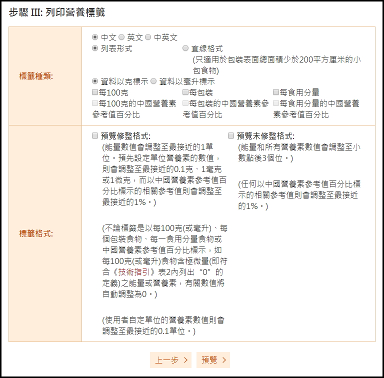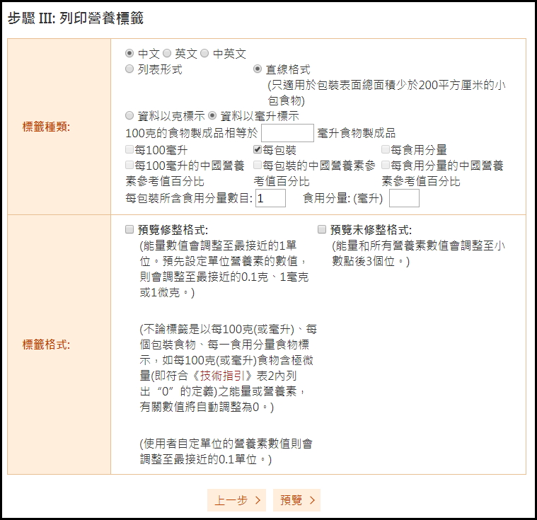 - 此选项只适用于以列表形式列印的标籤。请在"每100克(或毫升) "、"每包装"及∕或"每食用分量(克或毫升) "下剔选相应的方格。计算器将会自动计算相对中国营养素参考值之百分比。