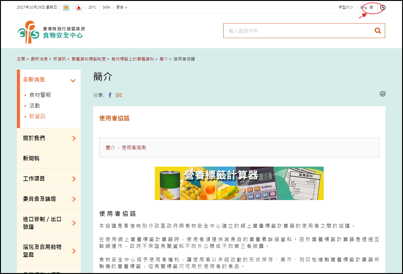 - 如果要使用网上营养标籤计算器(下称"计算器" ),使用者须细阅和明白《修订规例》、《技术指引》、《检测方法指引》和计算器的《简介》,并须在《使用者协议》一页中按"同意"键,以表示同意其中载明的规则和政策。使用者如按"取消"键,则会返回《简介》的页面,无法使用计算器。