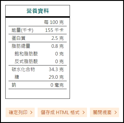 - "储存成HTML格式":把营养标籤储存成html格式,以供日后使用。使用者亦可使用键盘上的" Print Screen "功能键,撷取营养标籤的图像,然后储存,以便使用其他绘图软件加以编辑。