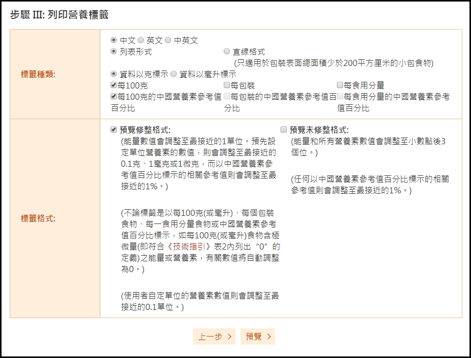 - 于"标籤格式"中选择"预览修整格式",以便在列印营养标籤前,预览计算后所得的营养资料最终数值。请注意,不论标籤是以每100克(或毫升)、每个包装食物、每一食用分量食物或中国营养素参考值百分比标示,如每100克(或毫升)食物含极微量(即符合《技术指引》表2内列出" 0 "的定义)之能量或营养素(包括蛋白质、碳水化合物(可获得或总量)、总脂肪、饱和脂肪酸、反式脂肪酸、钠、糖、膳食纤维及胆固醇),计算器将自动调整有关数值为0。