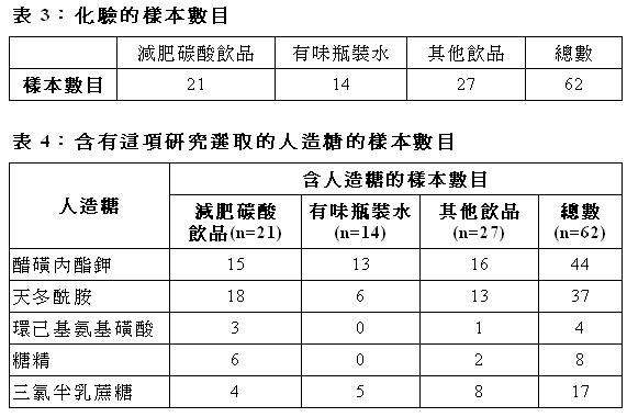 24. 食环署化验了62 款饮品。表3 列载每类饮品的样本数目。62 个样本全部含有一种或多种人造糖。表4 及表5 分别列载含有这项研究选取的人造糖的样本数目及其在样本中最低及最高含量;表6 则列述每类饮品的平均人造糖含量。样本的人造糖含量分布情况载于 附件II 。