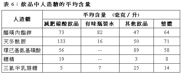 39. 一般中学生每日从饮品摄取到研究选取的各种人造糖的分量,按每公斤体重计算,估计分别为0.98 毫克醋磺内酯钾、0.57 毫克天冬酰胺、0.64 毫克环己基氨基磺酸、0.04 毫克糖精和0.22 毫克三氯半乳蔗糖。这些分量全部没有超出专家委员会就这些人造糖订定的每日可摄取量:其分量相对每日可摄取量的比率由糖精的0.8% 至醋磺内酯钾的6.5% 。