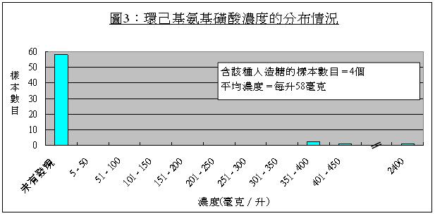 31. 食环署在这项研究中分析了62 个饮品样本,发现其中44 个含醋磺内酯钾(71%) 、37 个含天冬酰胺(60%) 、17 个含三氯半乳蔗糖(27%) 、8 个含糖精(13%) 。饮品一般较少使用环己基氨基磺酸,只有4 个样本(6%) 含有这种人造糖。