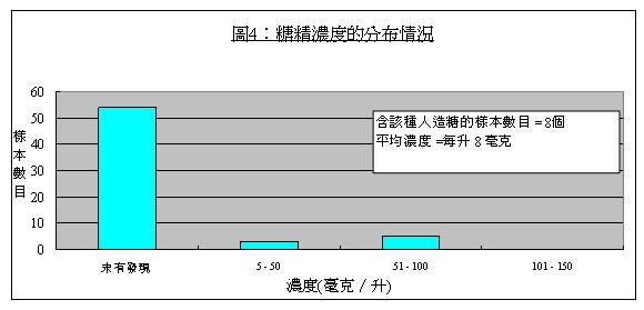 20. 这项研究样本中每种人造糖的检测量为每升4 毫克。人造糖属食物添加剂,除刻意加入食物外,不会在食物中存在。要达到甜味的效果,其分量必须超出检测量( 即每升4 毫克) 。因此,人造糖分量少于检测量的样本会当作零,以方便计算。