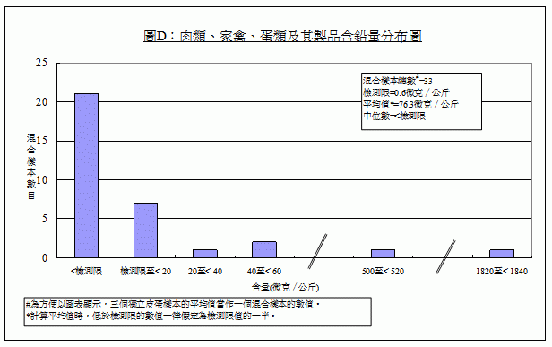 37. 我 们 曾 对 " 肉 类 、 家 禽 、 蛋 类 及 其 制 品 " 再 进 行 分 析 , 发 现 这 个 食 物 类 别 60% 以 上 的 样 本 的 含 铅 量 低 于 检 测 限 。 不 过 , 皮 蛋 的 含 铅 量 最 高 ( 平 均 值 为 每 公 斤 1.2 毫 克 ) 。 单 是 皮 蛋 已 占 总 摄 取 量 的 17% 或 占 摄 取 自 这 个 食 物 类 别 的 铅 分 量 的 79% 。 撇 除 皮 蛋 后 , 从 这 个 食 物 类 别 的 其 他 食 物 摄 取 到 铅 的 分 量 , 按 每 公 斤 体 重 计 算 , 是 每 周 0.09 微 克 , 占 总 摄 取 量 的 5% 。