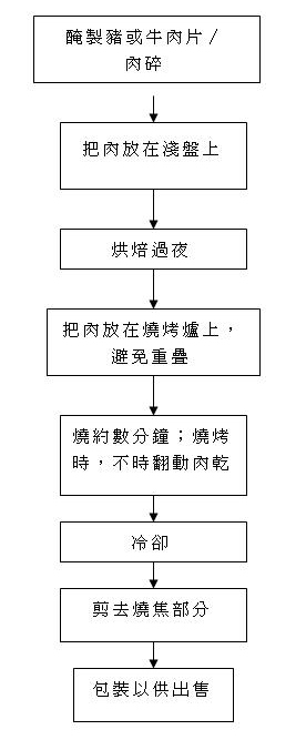 23. 肉 干 是 亚 洲 人 常 吃 的 肉 类 小 食 。 这 是 经 烧 烤 的 薄 切 肉 片 , 大 小 各 有 不 同 , 以 采 用 猪 肉 和 牛 肉 制 造 最 为 常 见 。 把 肉 放 在 金 属 架 上 , 然 后 置 于 热 源 之 上 或 之 间 烹 煮 。 热 源 可 以 是 电 热 器 或 明 火 。 肉 干 的 制 作 流 程 图 载 于 附 件 I 。