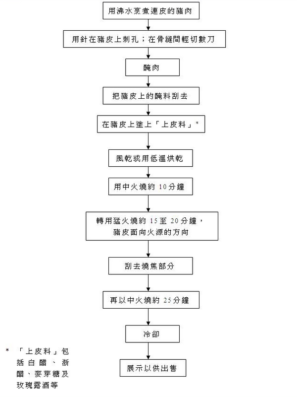 25. 烧 味 没 有 划 一 的 制 作 方 法 , 不 同 制 造 商 可 能 会 有 不 同 的 处 理 方 式 , 一 般 使 用 大 焗 炉 或 大 小 不 同 的 烧 烤 炉 烹 煮 。 烹 煮 烧 味 的 方 法 有 多 种 , 包 括 炭 炉 ∕ 气 体 炉 烧 烤 , 以 及 电 炉 烘 焗 。 此 外 , 热 源 与 食 物 的 相 对 位 置 亦 有 差 别 。 三 种 最 常 食 用 的 烧 味 中 , 烧 肉 一 般 以 中 火 至 高 温 火 ( 摄 氏 330 度 以 上 ) 烧 烤 ∕ 烘 焗 , 叉 烧 使 用 中 火 ( 摄 氏 220 度 以 上 ) , 烧 鸭 则 多 以 中 慢 火 ( 摄 氏 160 度 至 200 度 ) 烧 烤 ∕ 烘 焗 。 制 作 叉 烧 、 烧 肉 及 烧 鸭 的 一 般 流 程 图 , 分 别 载 于 附 件 II 、 III 及 IV 。